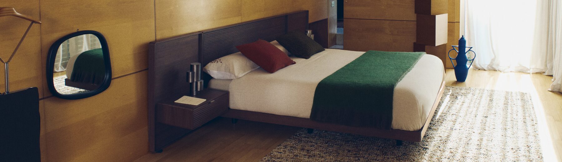 Lit Norlen avec 2 tables de nuit en placage de noyer avec finition foncée et lumière LED pour matelas 180×200 cm