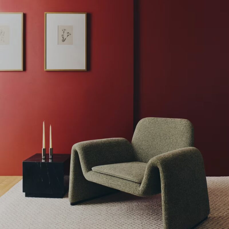 Fauteuil Eamy en chenille beige, placage de frêne avec finition naturelle et métal beige