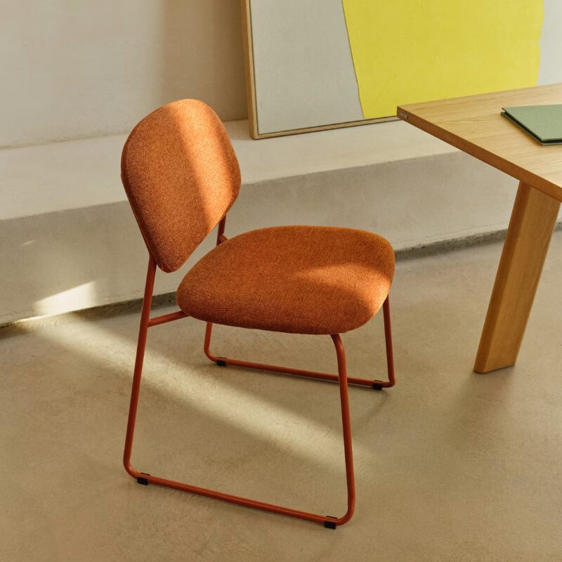 Chaise empilable Meli en chenille terracota et pieds en métal terracota