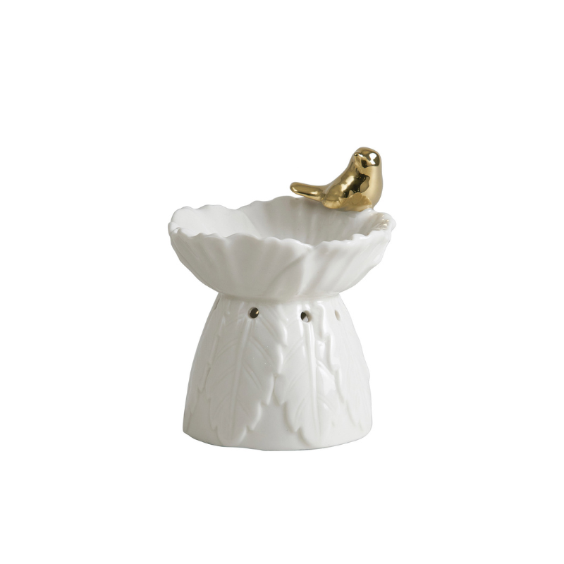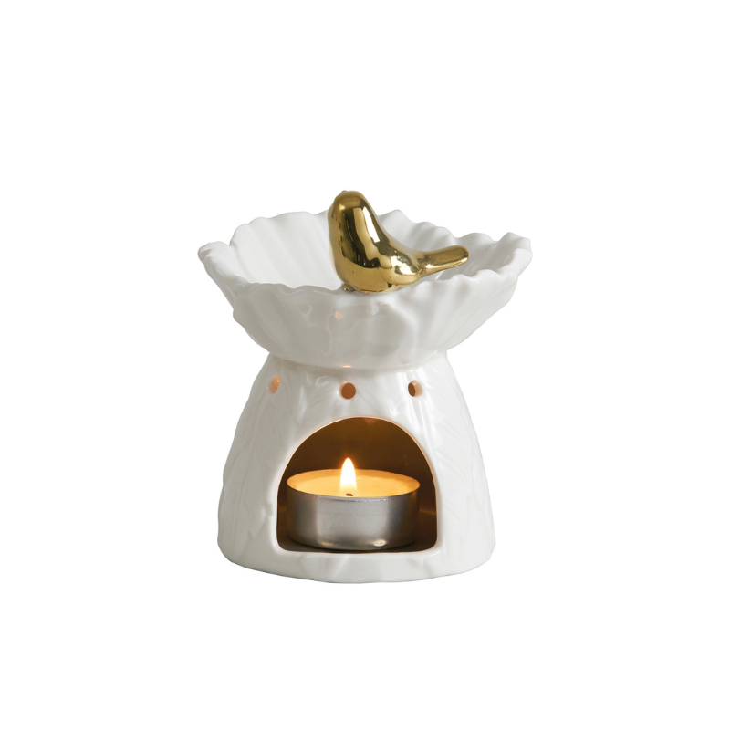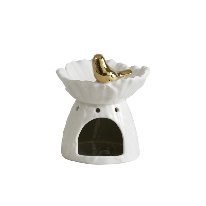La poésie s’invite dans votre intérieur avec cet élégant brûle-parfum orné de motifs végétaux et d’un délicat oiseau doré. Il permettra de parfumer la pièce tout en diffusant la douce lueur de sa bougie.