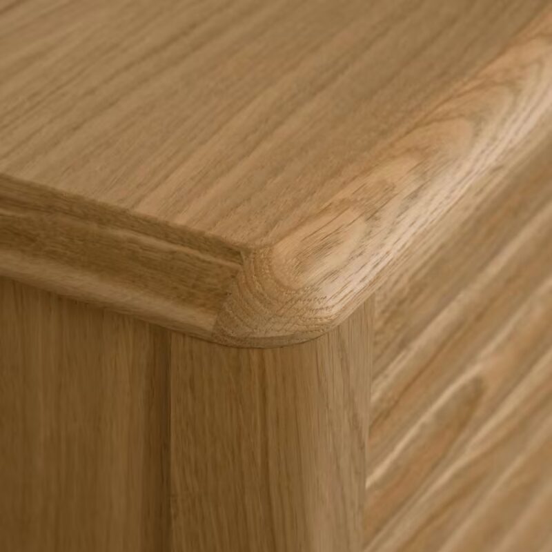 Buffet en bois massif et placage de chêne. Un design unique aux coins arrondis et au relief sur les portes.
