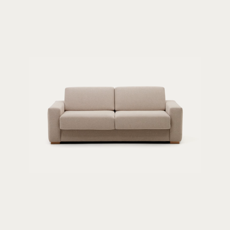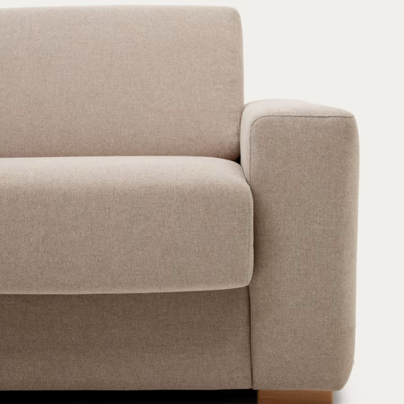 Canapé-lit avec une tapisserie en tissu structuré beige et des pieds en bois massif de hêtre.