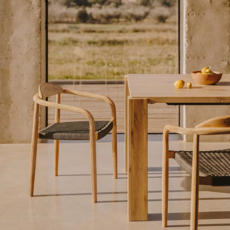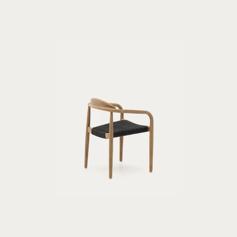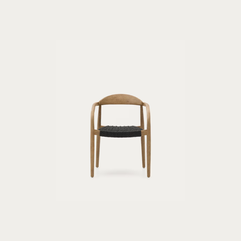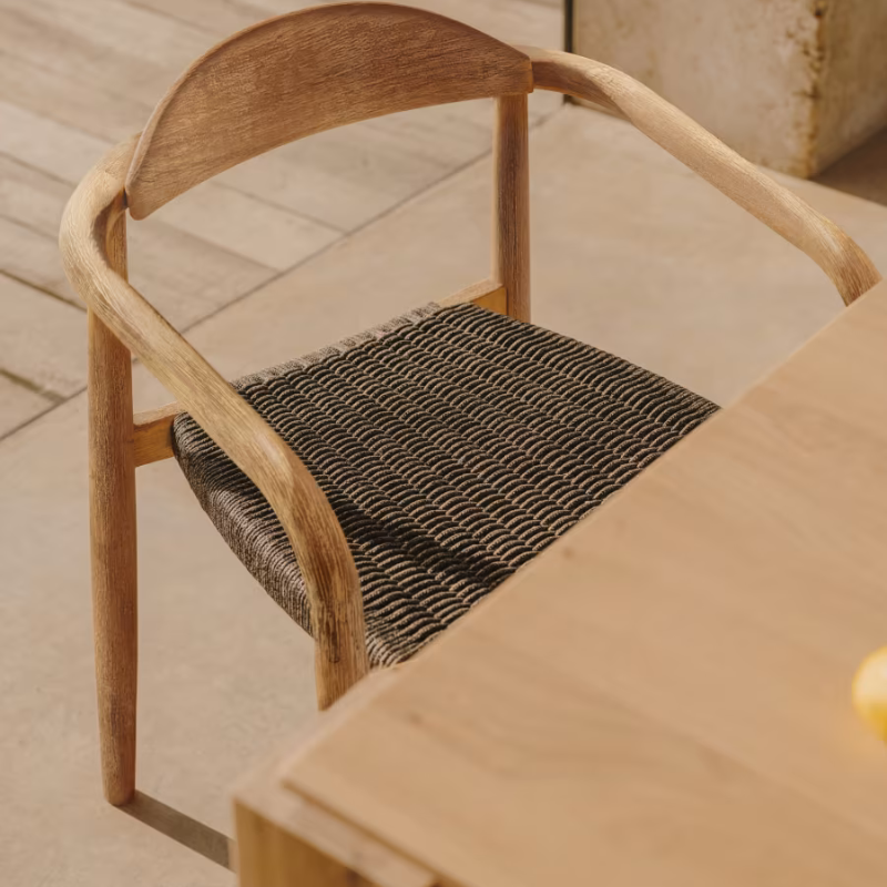 Une chaise empilable avec accoudoirs, conçue avec des matières naturelles et une fabrication artisanale.