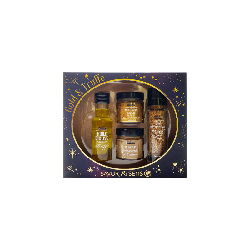 Laissez-vous tenter par notre coffret Gold & Truffe, une sélection de produits luxueux et raffinés. Ce coffret contient une huile d’olive vierge extra saveur truffe, une moutarde trésor au jus de truffe brumale, du sel doré aux graines croquantes couleur or et une douceur de chanterelles au Sauternes. Chaque produit est une invitation à un voyage culinaire unique et sophistiqué.