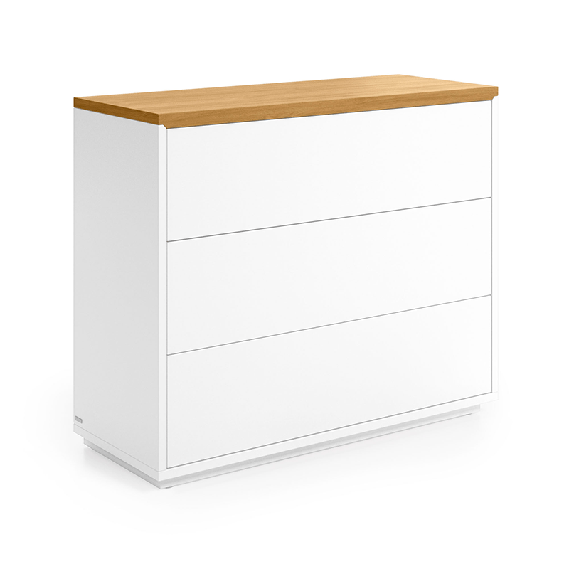 - Commode 90 x 74,8 cm avec dessus en contreplaqué de chêne et 3 tiroirs laqués en blanc