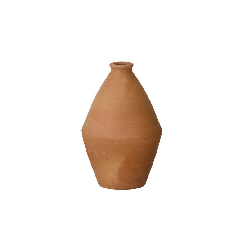 Notre collection de vases en terre cuite est entièrement façonnée à la main en Inde. Ce pays possède une ancienne tradition de poterie, où les techniques artisanales se transmettent de génération en génération. La poterie y est bien plus qu’un savoir-faire : c’est un art qui reflète la région, la culture et l’histoire de chaque artisan. Ce vase est destiné uniquement à la décoration. Il n’est pas étanche, ce qui le rend parfait pour accueillir des fleurs séchées ou artificielles.