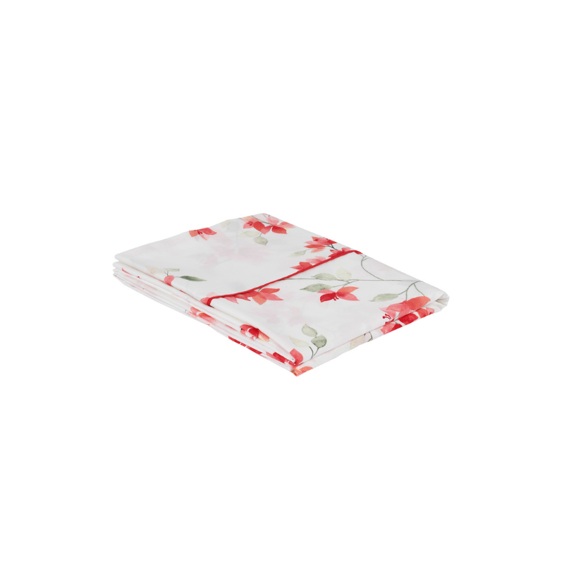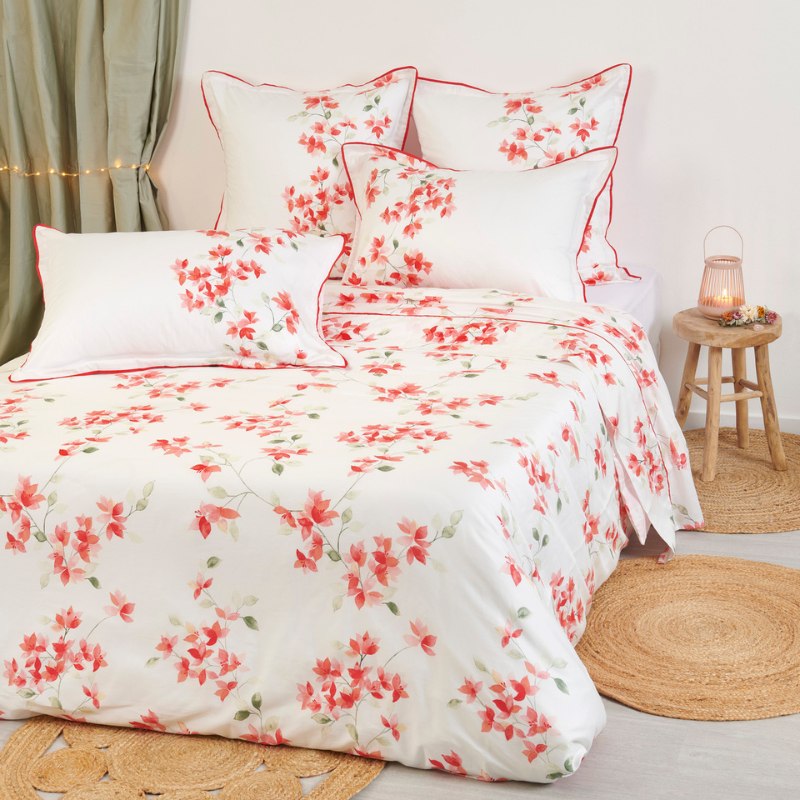 La collection Calice est une invitation au pays du chic et de l’élégance avec son magnifique satin de coton blanc 120 fils/cm?. Le ravissant motif floral rouge dessiné en aquarelle, et ses petites feuilles vertes ajouteront une touche artistique pleine de douceur à l’ambiance de votre chambre.