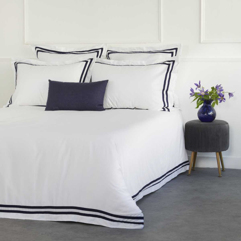 Découvrez notre toute nouvelle collection « Marise » en satin de coton 120 fils pour une parure de lit qui incarne l’élégance et le raffinement. Conçue dans un luxueux satin de coton blanc, cette collection apporte une touche chic à votre chambre à coucher. Son élément distinctif est la bande appliquée en couleur marine qui forme un parement autour de la housse de couette et des taies, ajoutant une dimension visuelle unique et un contraste subtil.