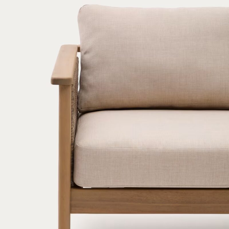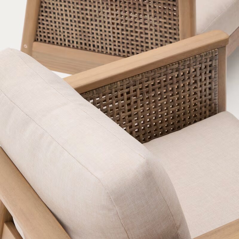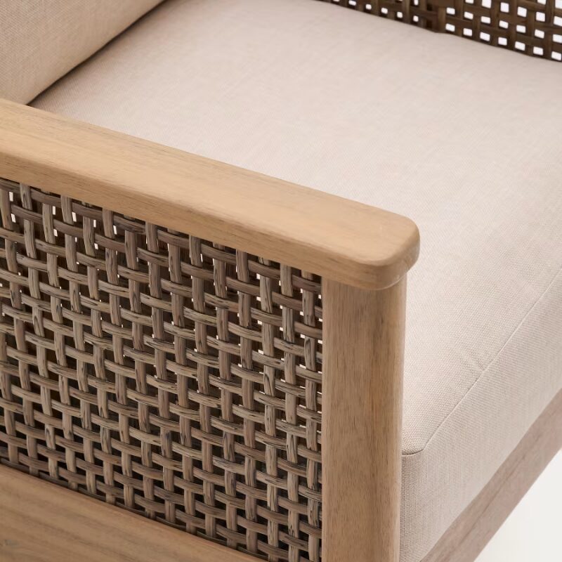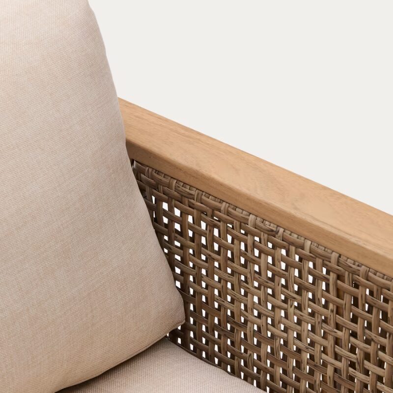 Matériaux : 70% Bois d’acacia (Acacia Mangium), 15% Osier synthétique, 8% Mousse polyuréthane, 5% Tissu, 2% Sangle