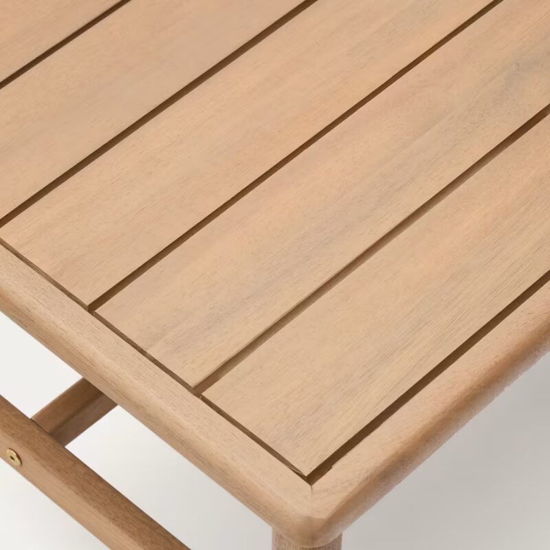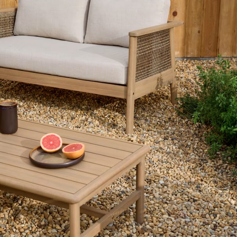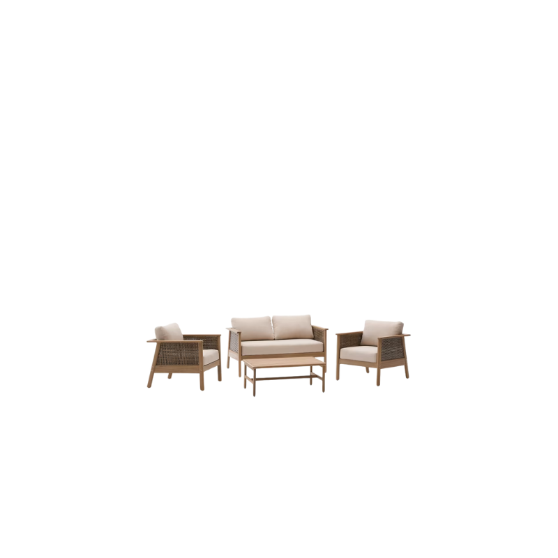 Ensemble composé d’un canapé 2 places, de 2 fauteuils et d’une table basse en bois d’acacia.
