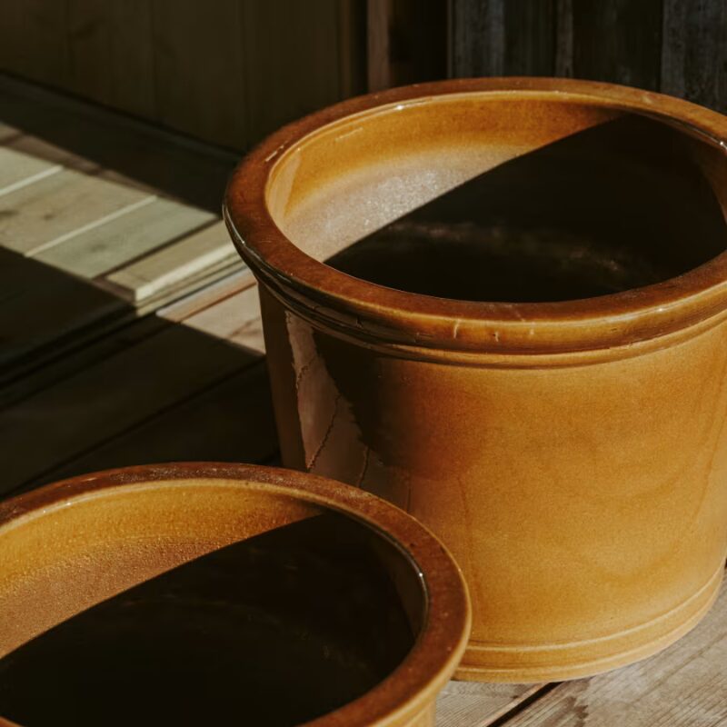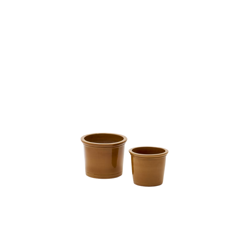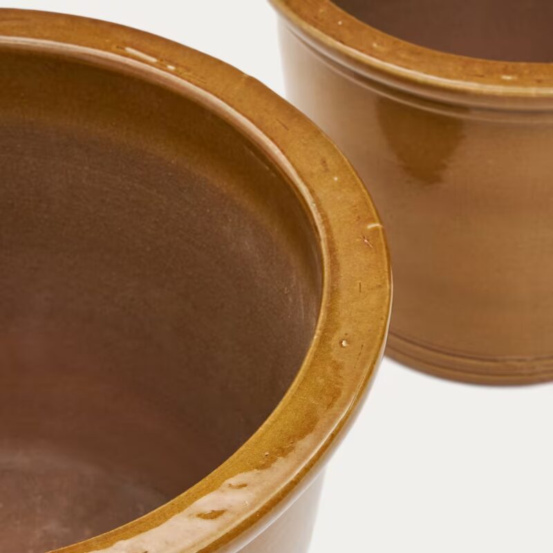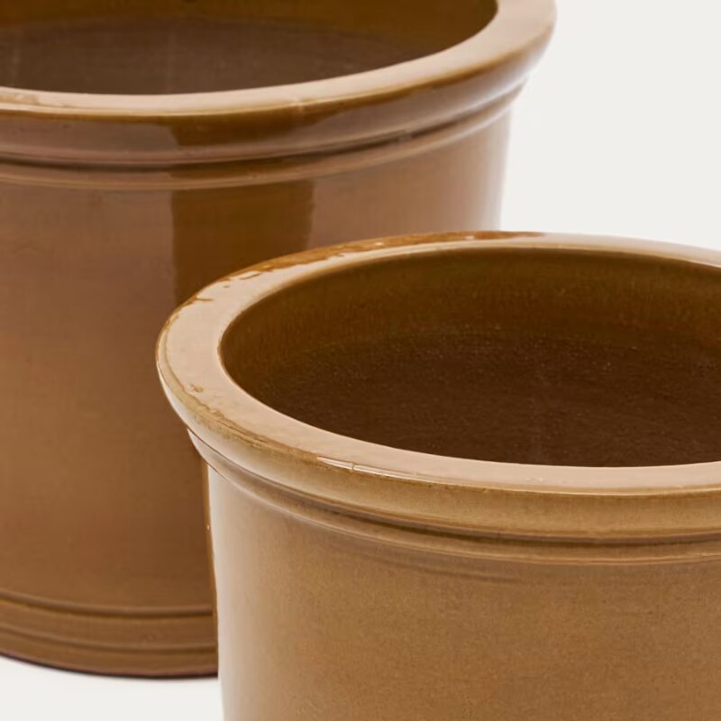 Ensemble de 2 pots de fleurs en céramique, finition moutarde vernissée.