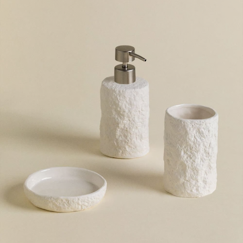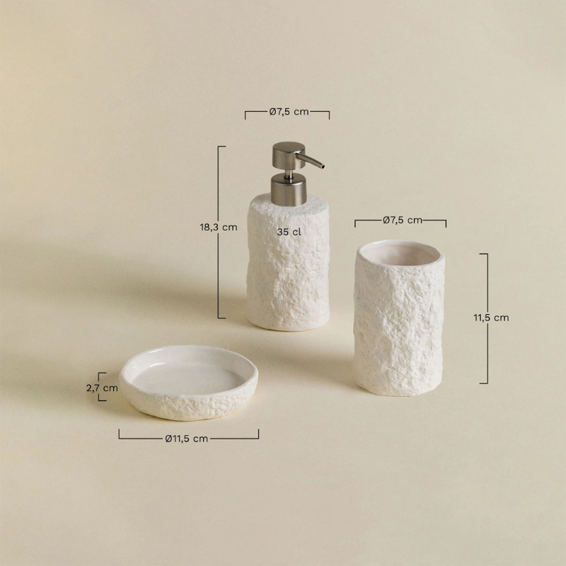 Cet ensemble de salle de bain en grès Zolave apporte une touche moderne et fonctionnelle à n’importe quelle salle de bain. Composé d’un distributeur de savon avec pompe en ABS et de deux récipients supplémentaires, l’un idéal pour être utilisé comme porte-brosse à dents et l’autre comme porte-savon. Ils se distinguent par leur construction en grès, avec une surface rugueuse au ton clair , qui donne un aspect frais et propre à l’espace. Le design est simple, mais sa finition texturée ajoute une touche unique qui peut facilement s’agencer à différents styles de décoration dans la salle de bain. En plus de son esthétique, cet ensemble est parfait pour maintenir l’organisation dans l’espace toilettes , en donnant une place spécifique à chaque élément. La combinaison des matériaux garantit une durabilité et un entretien facile.