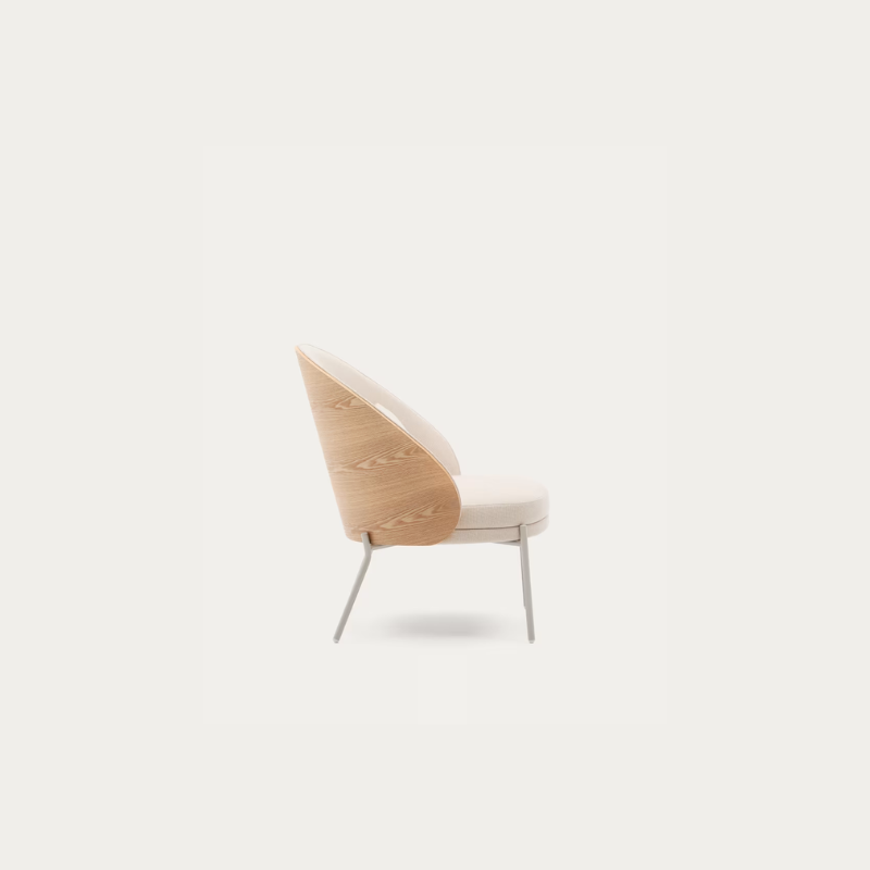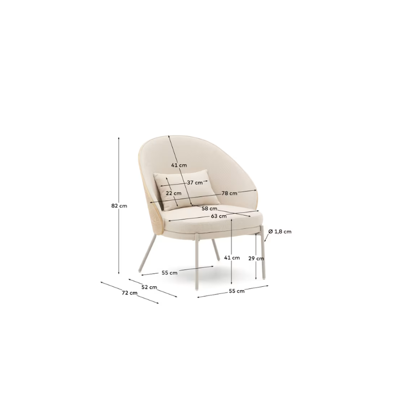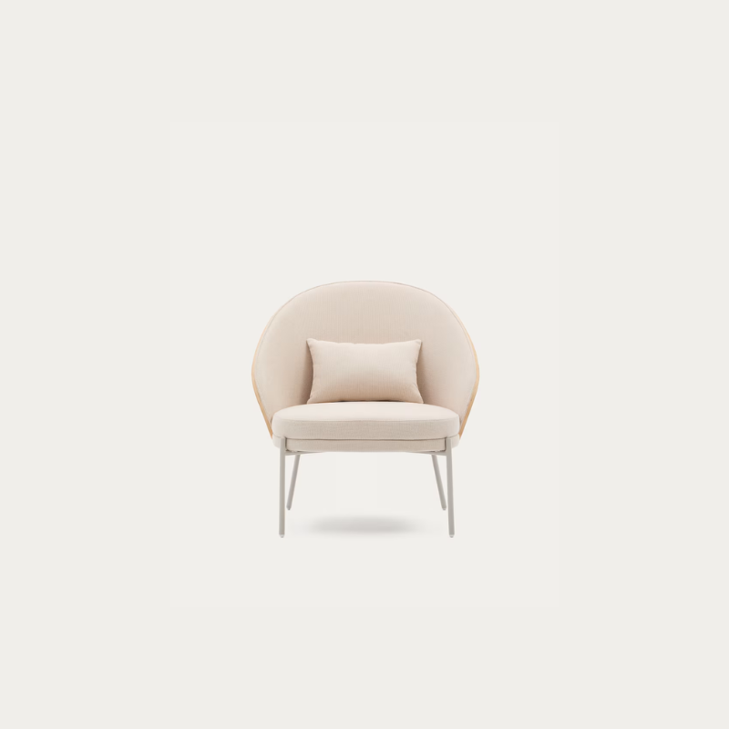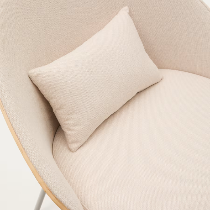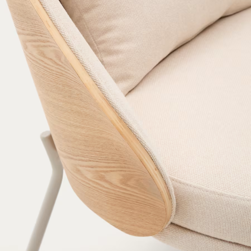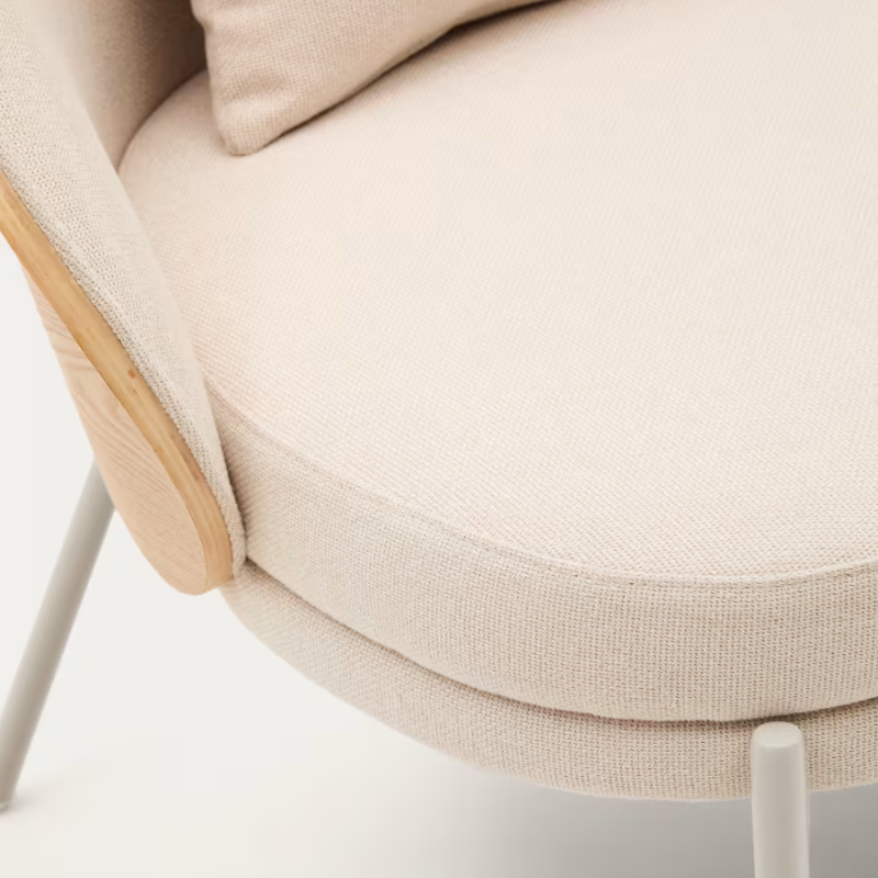 Fauteuil Eamy en chenille beige, placage de frêne avec finition naturelle et métal beige
