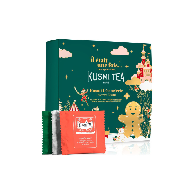 Cette année pour les fêtes, le coffret « Kusmi Découverte » se pare d’un magnifique décor sur fond vert sapin inspiré de l’univers enchanteur de vos contes préférés. À l’intérieur, 45 sachets bio avec neuf mélanges phares de la maison :