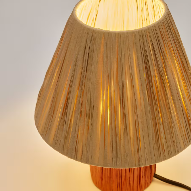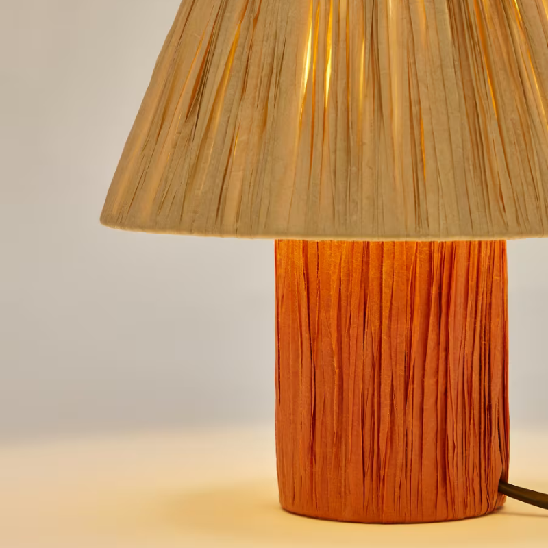 Lampe de table en raphia avec finition naturelle et terracotta.