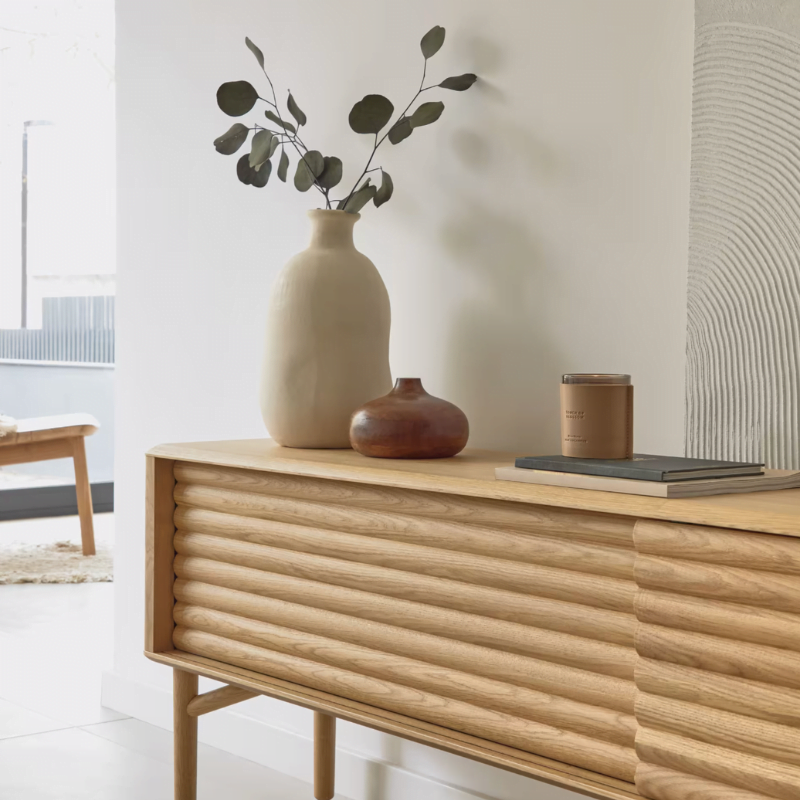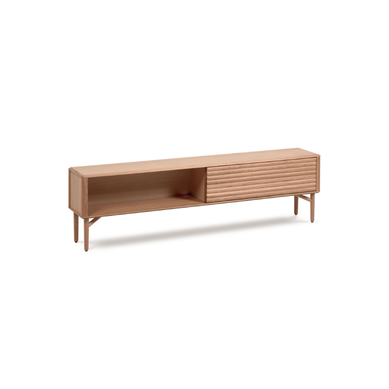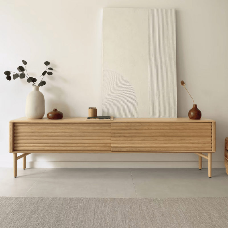 Meuble TV en bois massif et placage de chêne. Un design unique aux coins arrondis et au relief sur les portes.
