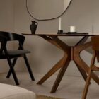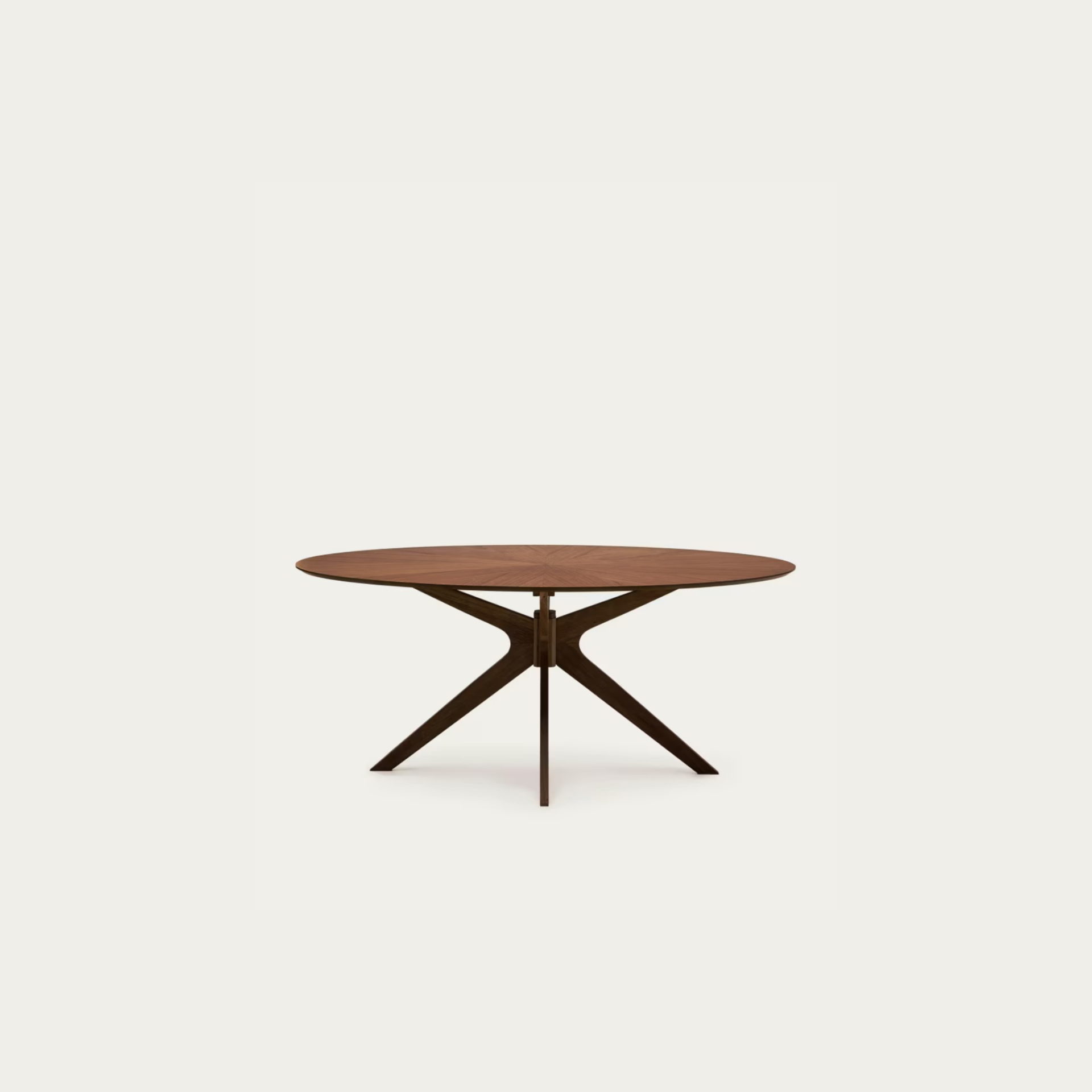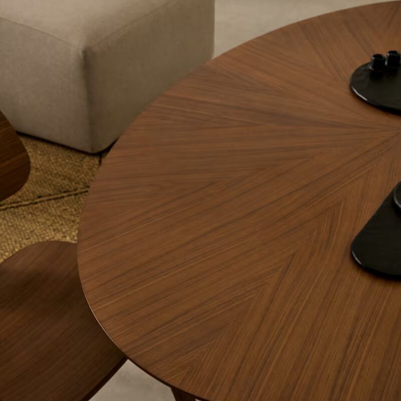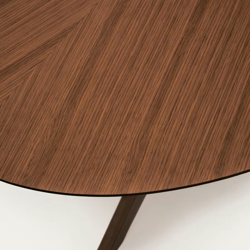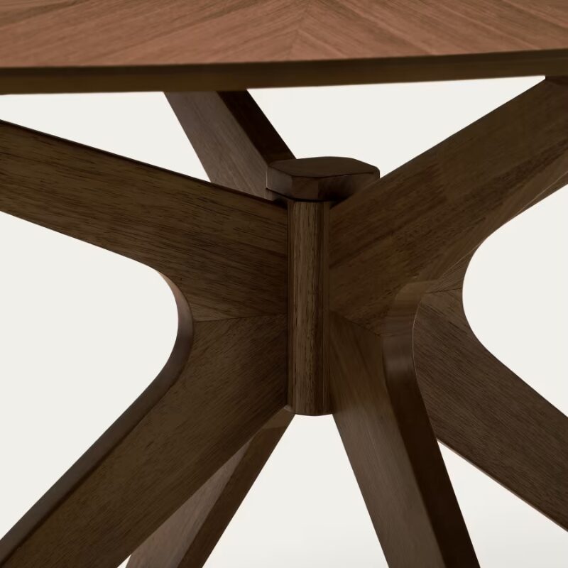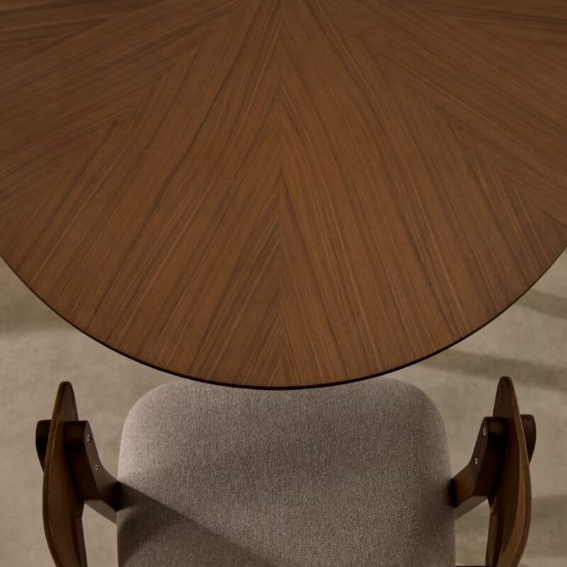 Chaque table Naanim est unique, fabriquée avec du placage naturel de noyer et des pieds en bois massif de caoutchouc. De plus, les veines convergent en forme d’étoile avec des tonalités exclusives, lui conférant un caractère distinctif.