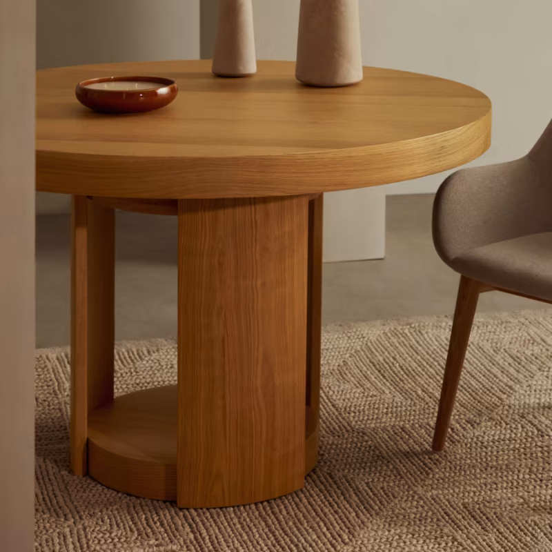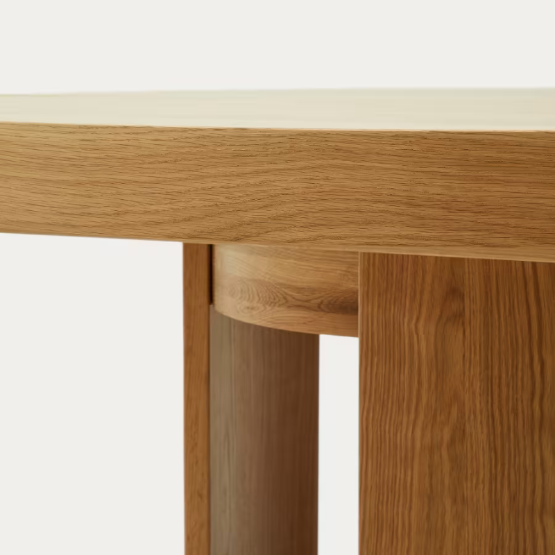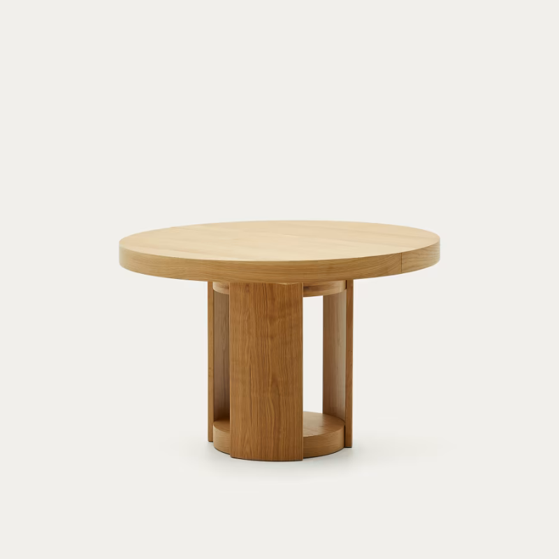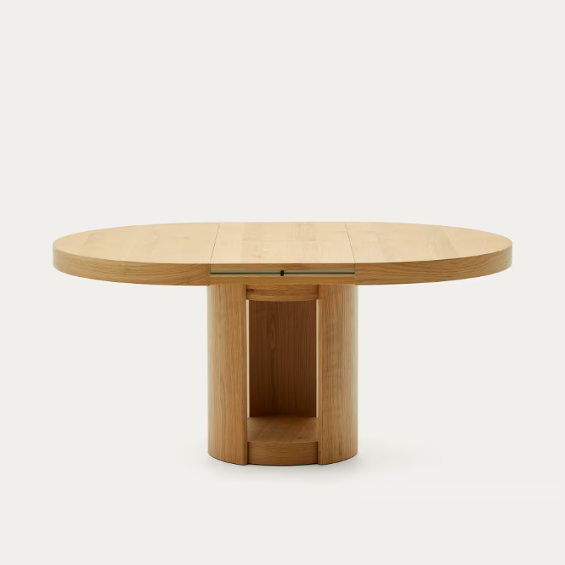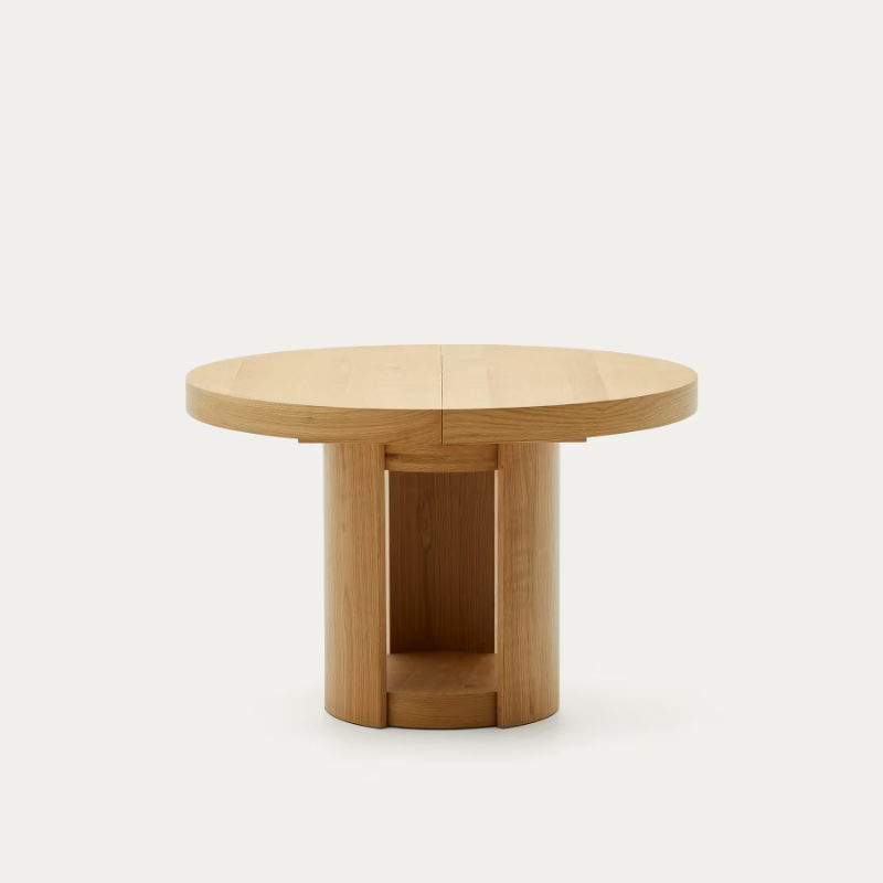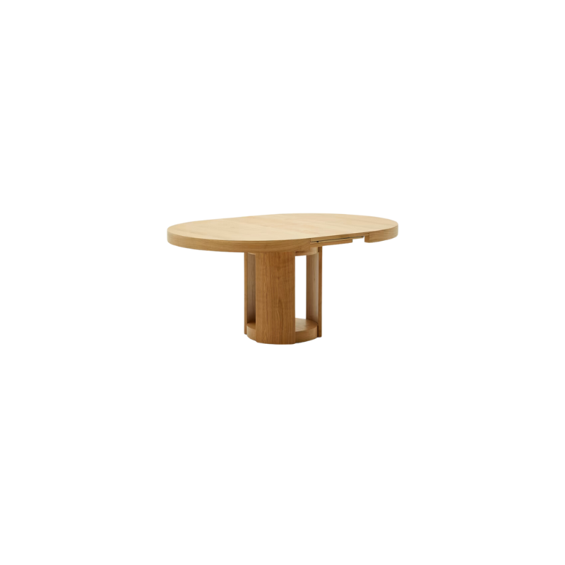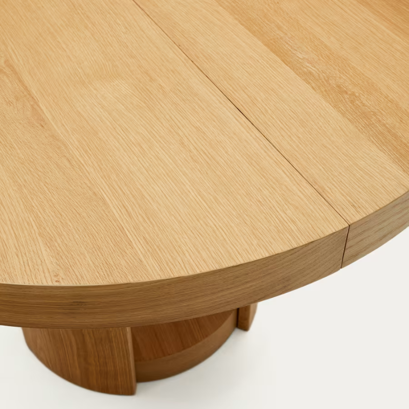 Table extensible en placage de chêne, finition naturelle.