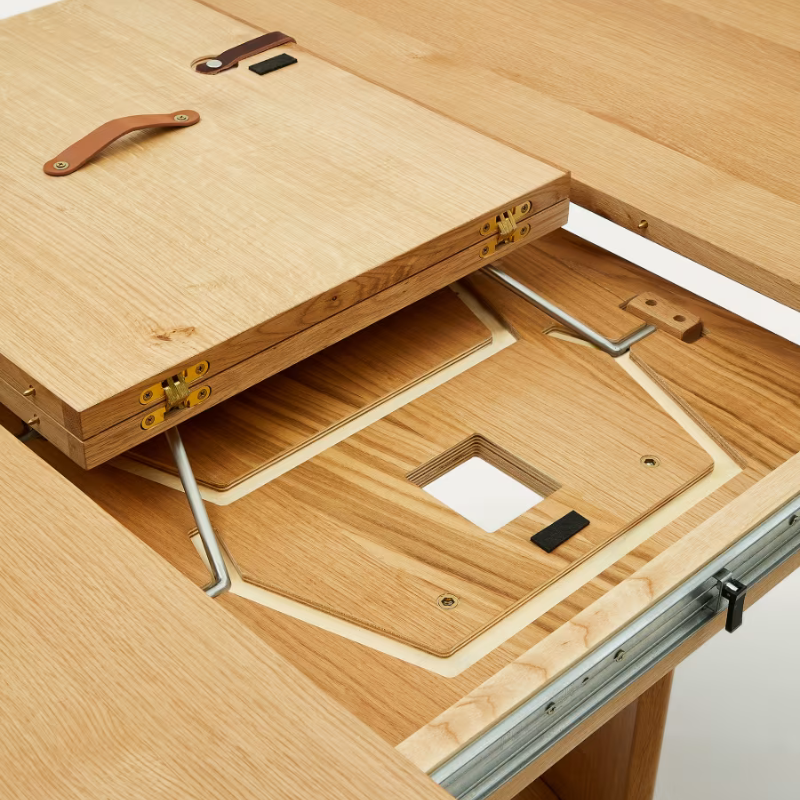Mécanisme extensible avec rallonge papillon à ouverture facile à l’aide d’une poignée en cuir. Inclut une allonge de 50 cm cachée à l’intérieur de la table.