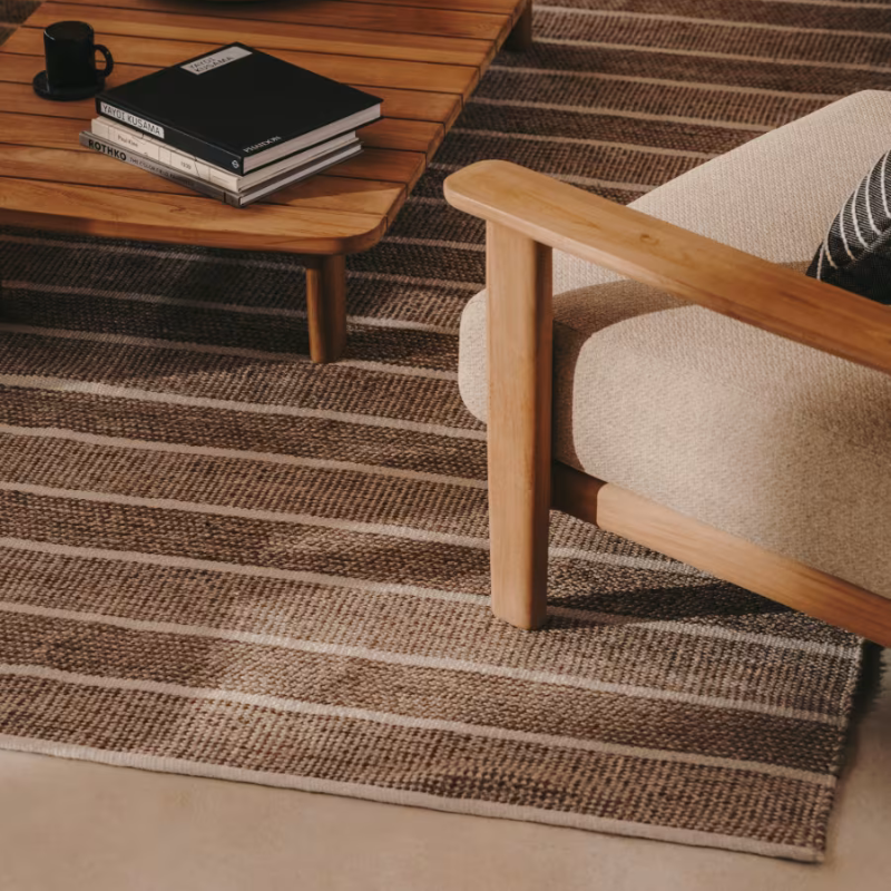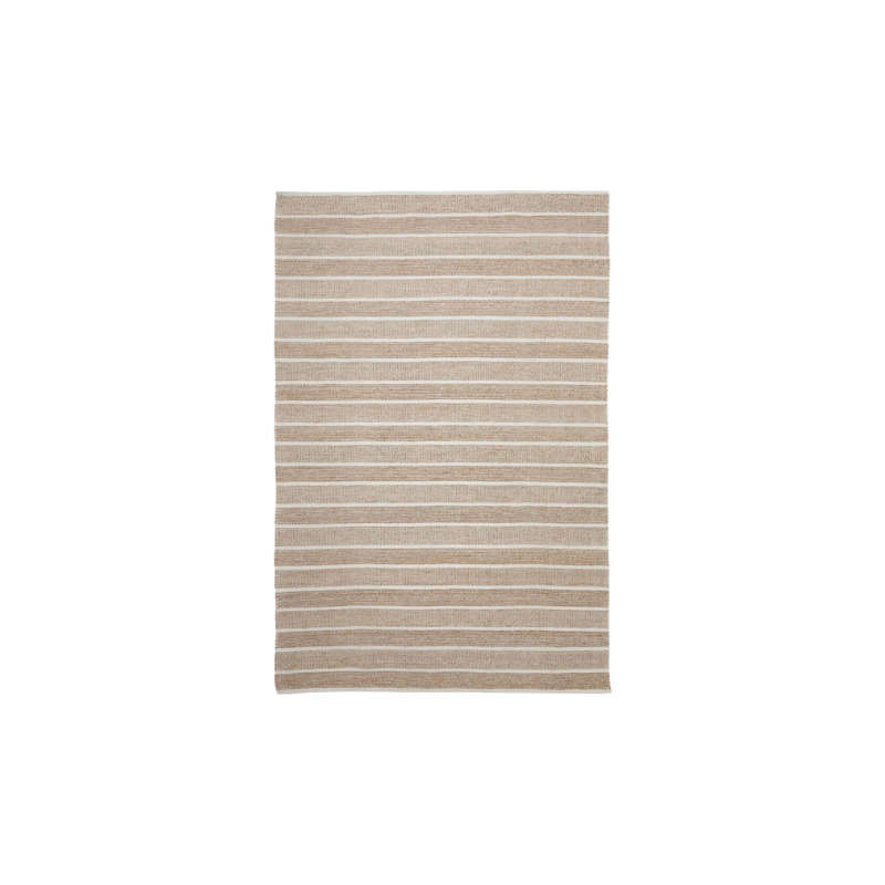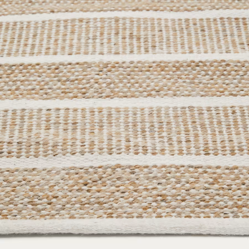 Tapis à rayures bicolores, tissé à la main avec des fibres 100% PET recyclé.
