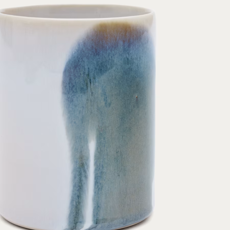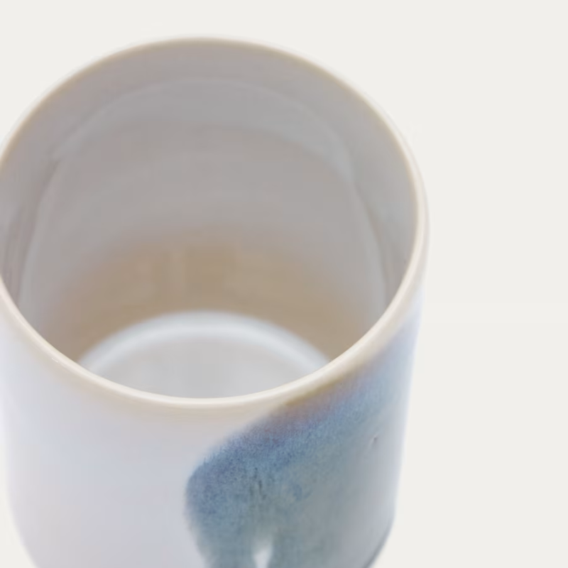 Tasse en céramique en couleur bleue et blanche.